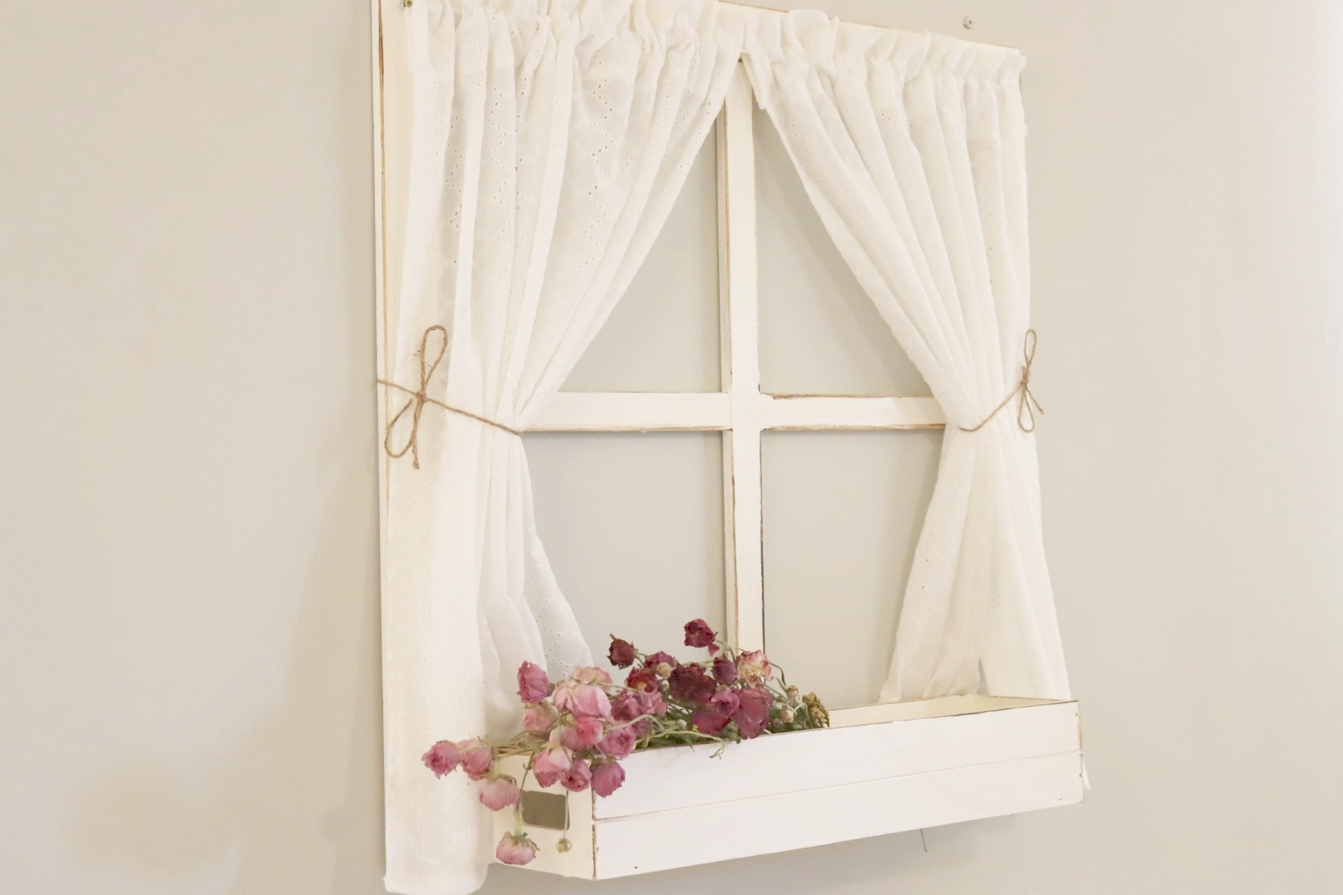 חלון אדנית מעץ, הנעשה בעבודת יד מוקפדת בעל וילון/ כותרת מכותנה.